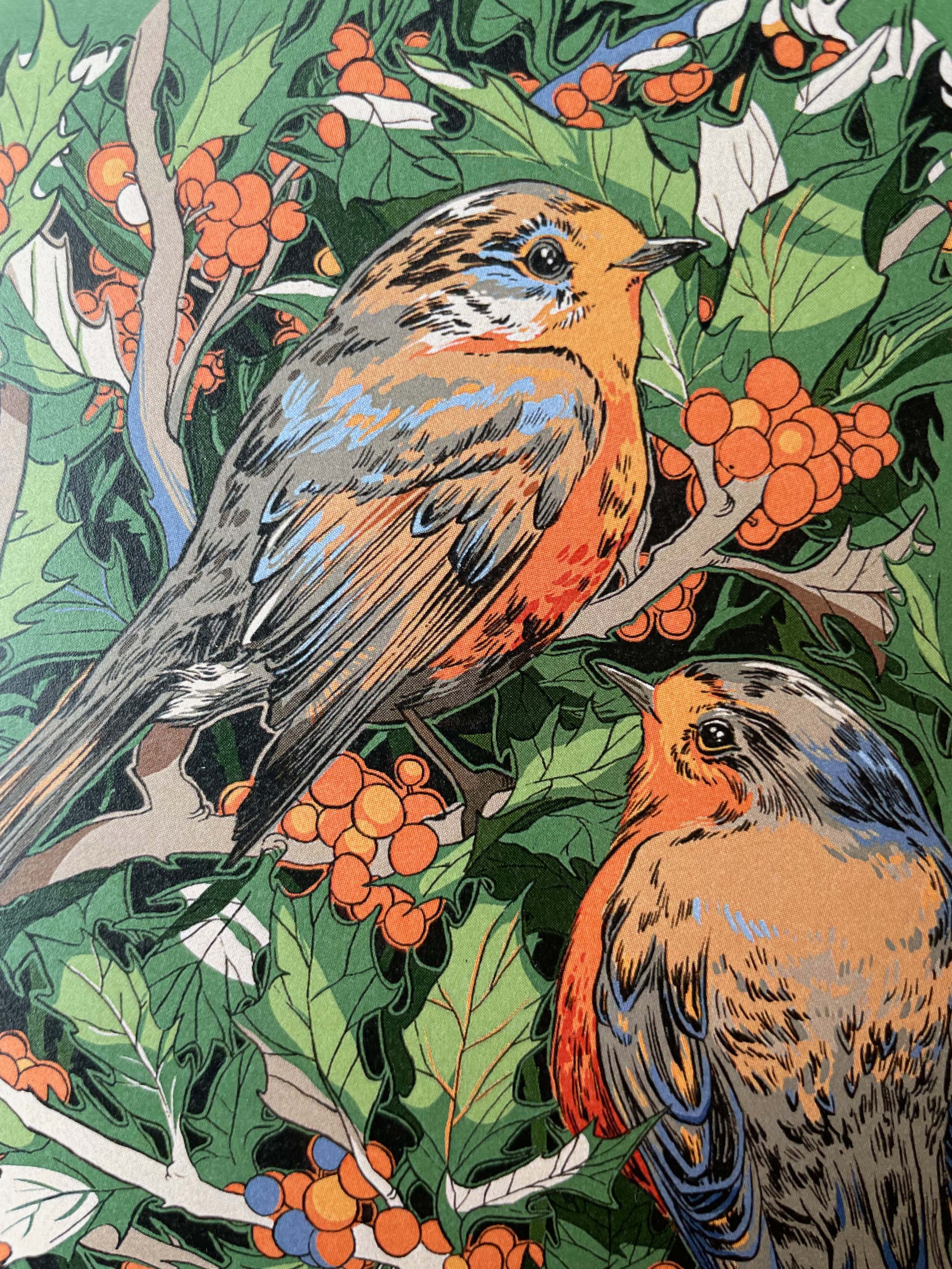 Two festive robins nestle together in a colourful holly bush in this Christmas card, which comes in size A6.